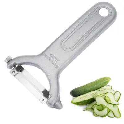 Schil je groenten en fruit met de Westmark Dunschiller van aluminium. De dunschiller heeft een mes dat gemaakt is van sterk RVS. Het mes van de dunschiller heeft een breed snijblad, waarmee je lange banen kunt schillen. Schil wortel en komkommers voor een lekkere rauwkost salade of schil er je aardappels mee voor de stamppot. Na gebruik kan de dunschiller in de vaatwasmachine. Afmeting: 12,8 x 7,7 x 1,5 cm.